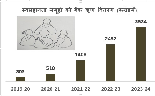 मध्यप्रदेश में महिलाओं के स्व-सहायता समूहों की बढ़ती आर्थिक गतिविधियों से ग्रामीण अर्थव्यवस्था अब तेजी से मजबूत हो रही है। वर्ष 2023-24 में एक लाख 63 हजार 500 स्व-सहायता समूहों को सार्वजनिक, निजी और क्षेत्रीय ग्रामीण बैंकों ने आर्थिक गतिविधियां शुरू करने के लिए 3584 करोड़ का ऋण उपलब्ध कराया गया। वर्ष 2012-13 से अब तक 7.09 लाख स्व-सहायता समूहों को 10 हजार 337 करोड़ रूपए का बैंक ऋण उपलब्ध कराया गया। पिछले पांच सालों में स्व-सहायता समूहों के आर्थिक रूप से सक्षम होने से बैंकों द्वारा दी जाने वाली ऋण की राशि भी बढ़ती जा रही है।
