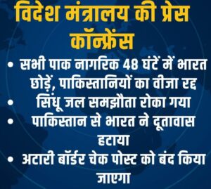 पहलगाम आतंकी हमले पर केंद्र सरकार सख्त हो गई दिखती है उसने आज एक बैठक में बड़े फैसले लिए हैं, सिंधु जल समझौता रोका दिया गया है इसके जल बंटवारे को पाकिस्तान को मिलने वाला पानी बंद कर दिया जाएगा। उच्चायोग में अधिकारियों की संख्या घट जाएगी। दोनों देशों की स्टाफ काम किए जाएंगे। अटारी बाघा बॉर्डर चेक पोस्ट बंद कर दिया जाएगा। पाकिस्तानी नागरिकों को सार्क वीजा नहीं मिलेगा सार्क विजा वाले 48 घंटे में वापस लौटेंगे। संभव है कल एक बैठक करके विपक्षी पार्टियों के साथ निर्णय को साझा किया जाए। की सरकार क्या करने वाली है। कल पहलगाम में आतंकवादी घटना में 27 पर्यटकों की हत्या कर दी गई थी।