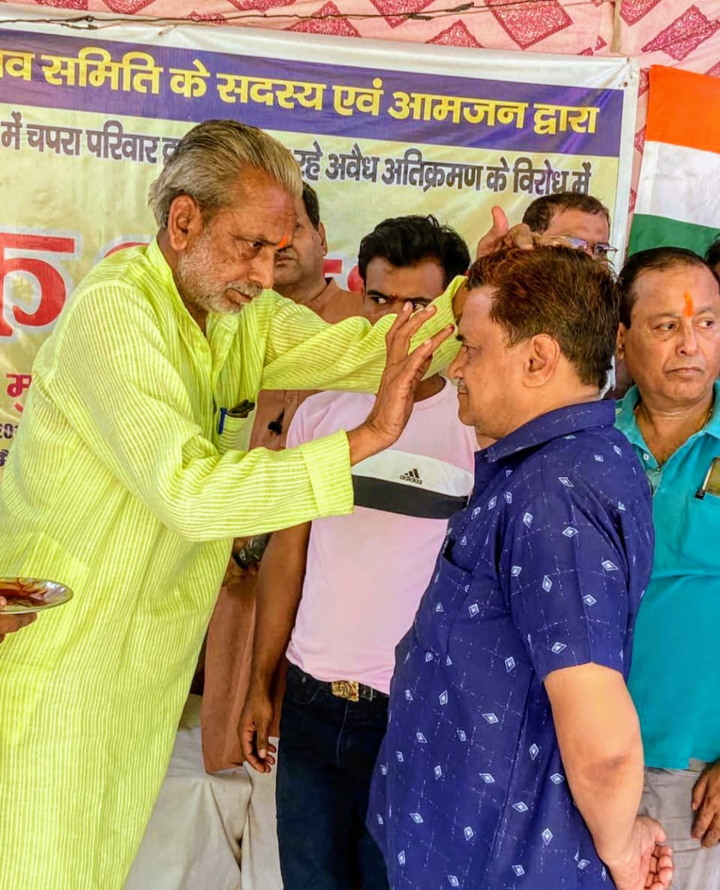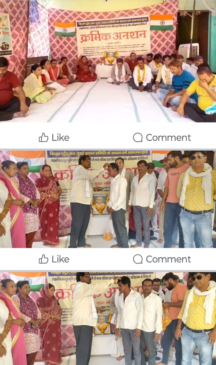 राजीव उपाध्याय ने कहा की किरन टॉकीज की यह जमीन हमेशा से दुर्गा पूजा व सामाजिक सरोकारों की भूमि रही है मैं तो चपरा परिवार के लोगों से यह आग्रह करना चाहता हूं कि जब सीमांकन हो चुका है और यह भूमि शासकीय निकली है तो उस जमीन का जनहित में मोह छोड़ देना चाहिए जो पर्दा खंभा लगाया है उसे हटाले इसी में बड़प्पन है ।जब किआंदोलन का 59 वां दिन राजेंद्र वर्मा जी ने अनशन का प्रारंभ राष्ट्र का महात्मा गांधी के माल्यार्पण से किया तत्पश्चात नौजवान संतोष चौधरी भैयालाल नापित को तिलक लगाकर माला पहनकर आगामी 24 घंटे के लिए बैठाया।