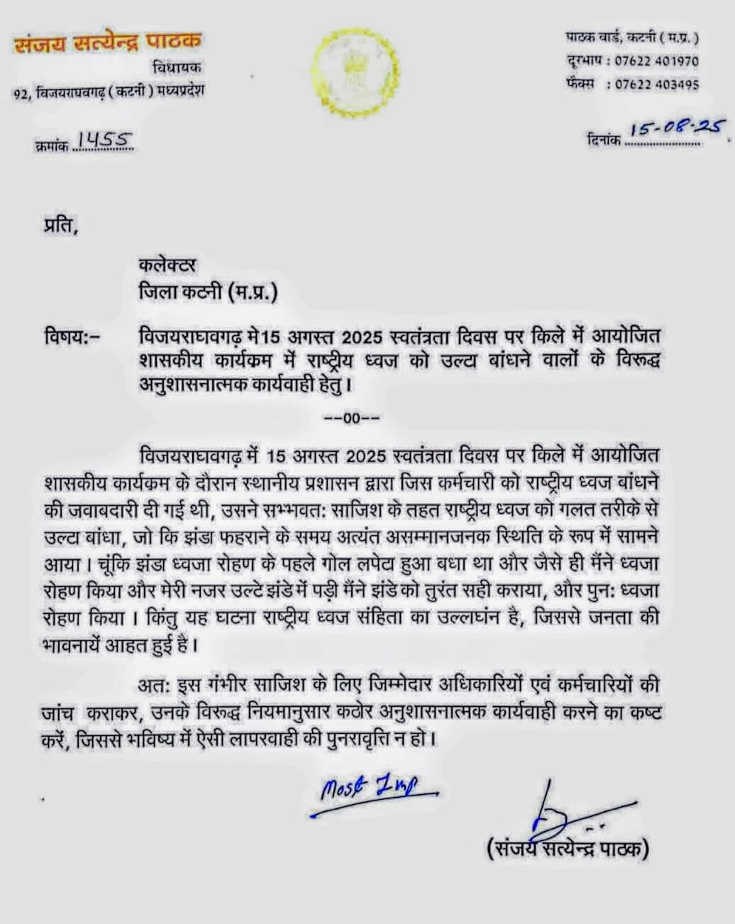 मुहाजिर की तुलना संजय पाठक के उस संघर्ष को दर्शाती है, जो वे अपनी सियासी और व्यावसायिक पहचान को बनाए रखने के लिए कर रहे हैं। कांग्रेस से भाजपा में आने के बाद उन्हें उम्मीद थी कि उनकी स्थिति मजबूत होगी, लेकिन आर्थिक अपराधों की जांच और साइबर क्राइम जैसे मामलों ने उनकी राह को कठिन बना दिया है। यह तुलना उनके उस तनाव और असुरक्षा को भी उजागर करती है, जो एक नए सियासी माहौल में अपनी जगह बनाने की कोशिश में उत्पन्न होती है।”उल्टा झंडा” फहराने के आरोप में घिरे विधायक संजय पाठक में चिट्ठी लिखकर न सिर्फ अपनी सफाई देते हुए बल्कि प्रशासनिक कार्य प्रणाली को उजागर करते हुए कहा है संभवत: साजिश के तहत राष्ट्रीय ध्वज को गलत तरीके से उल्टा बांधा जो की झंडा फहराने के समय अत्यंत असंम्मानजनक स्थिति के रूप में सामने आया चु़कि झंडा ध्वजारोहण के पहले को लपेटा हुआ बांधा था और जैसे ही मैं ध्वजारोहण किया और मेरी नजर उल्टे झंडे में पड़ी मैं झंडे को तुरंत सही कराया और पुनः ध्वजारोहण किया किंतु यह घटना राष्ट्रीय ध्वज संहिता का उल्लंघन है जिससे जनता की भावनाएं आहत हुई है अतः इस गंभीरता जिसके लिए कठोर अनुशासनात्मक कार्यवाही की जाए। देखना होगा भाजपा अपने विधायक के इस पत्र पर संबंधित दोसी कर्मचारियों के खिलाफ कोई कार्यवाही करती है या फिर उसे आई गई बातों में ले लेती है….