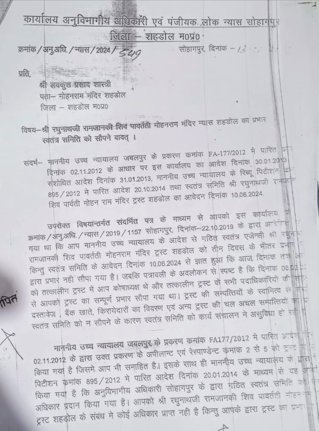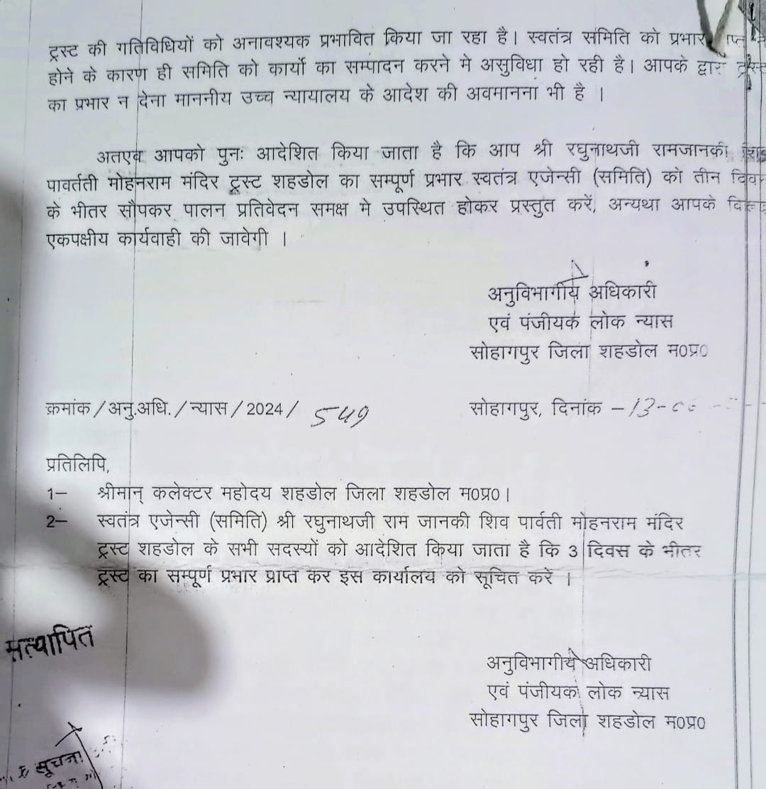 मध्य प्रदेश उच्च न्यायालय ने प्रकरण FA-177 वर्ष 2012 में एक महत्वपूर्ण आदेश पारित किया था, जिसमें शहडोल जिले के रघुनाथ जी राम जानकी शिव पार्वती मोहन राम मंदिर ट्रस्ट के विवादित पक्षकारों को अलग करते हुए, एसडीएम सोहागपुर को एक स्वतंत्र कमेटी गठित करने की जिम्मेदारी सौंपी गई थी। इस कमेटी का उद्देश्य ट्रस्ट का संपूर्ण प्रबंधन तब तक संभालना था, जब तक मामले का अंतिम निराकरण उच्च न्यायालय द्वारा नहीं हो जाता। यह आदेश ट्रस्ट में व्याप्त विवादों और संभावित अनियमितताओं को ध्यान में रखते हुए दिया गया था। हालांकि, आदेश की अनुपालना में कई बाधाएं आईं, जिनमें राजनीतिक दबाव और प्रशासनिक अनिच्छा प्रमुख रूप से शामिल रही।  उपलब्ध जानकारी के आधार पर इन घटनाक्रमों का विवरण प्रस्तुत किया जा रहा है।
