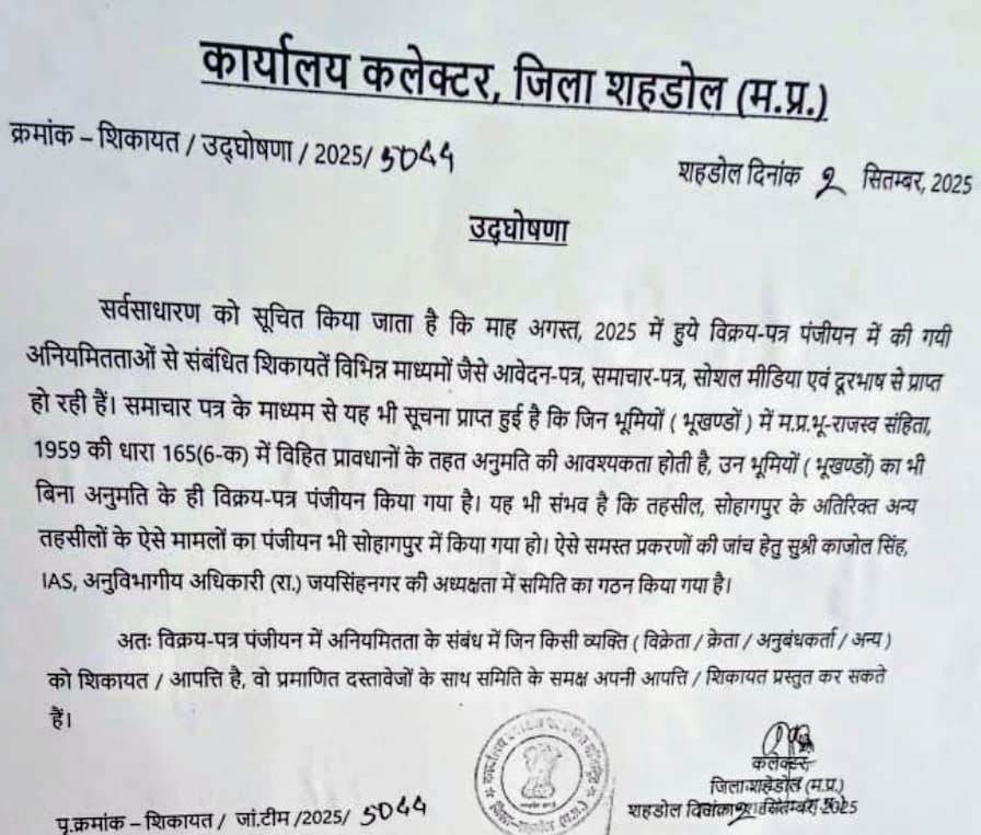 शहडोल – बिना अनुमति के हुई क्रय विक्रय रजिस्ट्रियों पर शहडोल प्रशासन द्वारा सतर्कता बरतते हुए एक उद्घोषणा जारी की गई है जिसमें आईएएस अधिकारी काजोल को प्रमुख बनाया गया है जो प्राप्तआम शिकायत कर्ता की शिकायतों पर कार्यवाही करेंगेउद्घोषणा में कहा गया हैसर्वसाधारण को सूचित किया जाता है कि माह अगस्त, 2025 में हुये विक्रय-पत्र पंजीयन में की गयीअनियमितताओं से संबंधित शिकायतें विभिन्न माध्यमों जैसे आवेदन-पत्र, समाचार-पत्र, सोशल मीडिया एवं दूरभाष से प्राप्तहो रही हैं।
