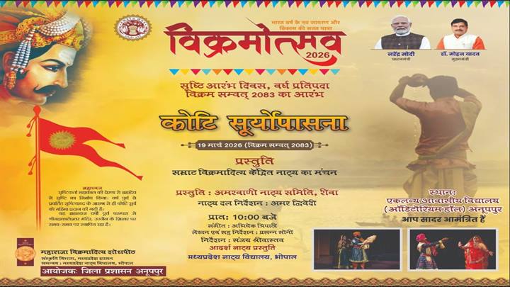विक्रमोत्सव- 2026 के अन्तर्गत सृष्टि आरंभ दिवस, वर्ष प्रतिपदा, विक्रम सम्वत् 2083 के शुभारंभ अवसर पर 19 मार्च 2026 को प्रातः 10ः00 बजे से एकलव्य आवासीय विद्यालय अनूपपुर के ऑडिटोरियम हॉल में ‘‘कोटि सूर्योपासना’’ कार्यक्रम आयोजित किया गया है। जिसमें अमरवाणी नाट्य समिति, रीवा द्वारा ‘‘सम्राट विक्रमादित्य’’ की नाट्य प्रस्तुति दी जाएगी। नाट्य का मंचन नाट्य दल निर्देशन श्री अमर द्विवेदी एवं नाट्य दल के सदस्यों द्वारा किया जायेगा। इस अवसर पर ब्रम्ह ध्वज का वंदन होगा। कार्यक्रम में सभी की उपस्थिति की अपील जिला प्रशासन द्वारा की गई है।